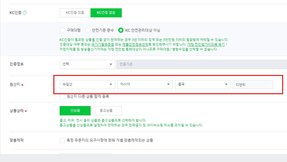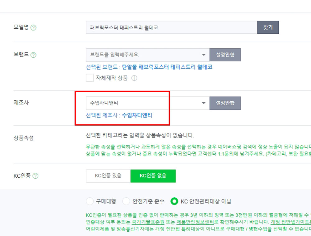 저는 KC인증이 필요 없는 제품이라 [KC인증 없음]을 선택했어요.