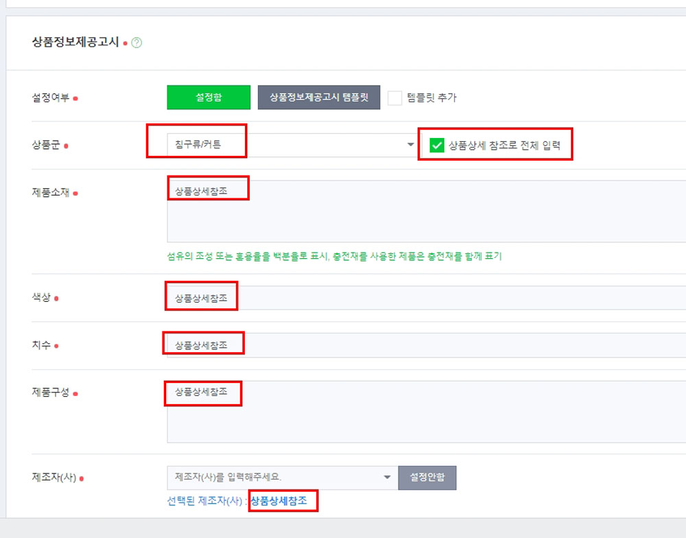 만일 상품정보제공고시의 상푼군에 해당카테고리를 설정 후 [상품상세 참조]로 전체 입력란에 체크를 하게 되면 아래 사진과 같이 전부 “상품 상세참조”라는 문구로 전부 대체가 됩니다.
