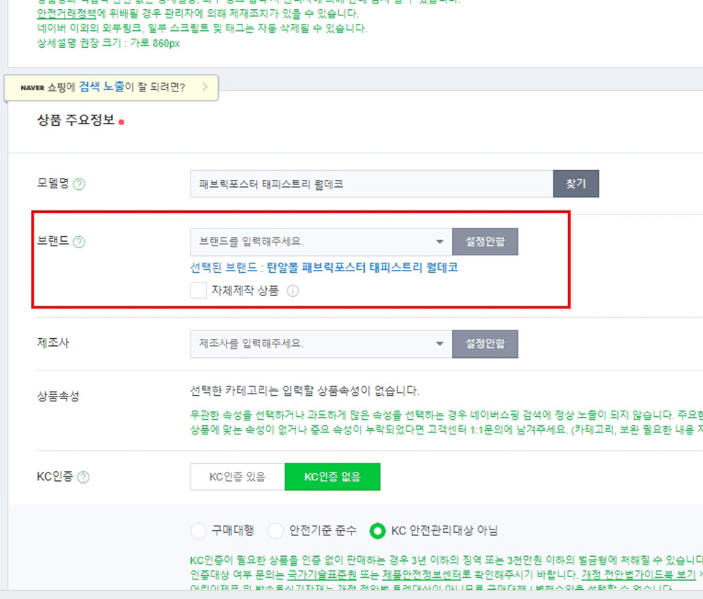 상품주요정보는 모델명, 브랜드, 제조사, 상품속성, KC인증, 원산지, 상품상태 등을 입력하는 곳입니다.