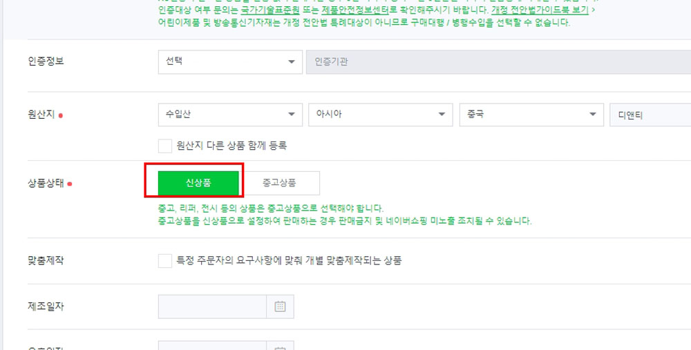 [상품상태]는 중고가 아니고 신상품이니까 [신상품]으로 선택해주세요.
