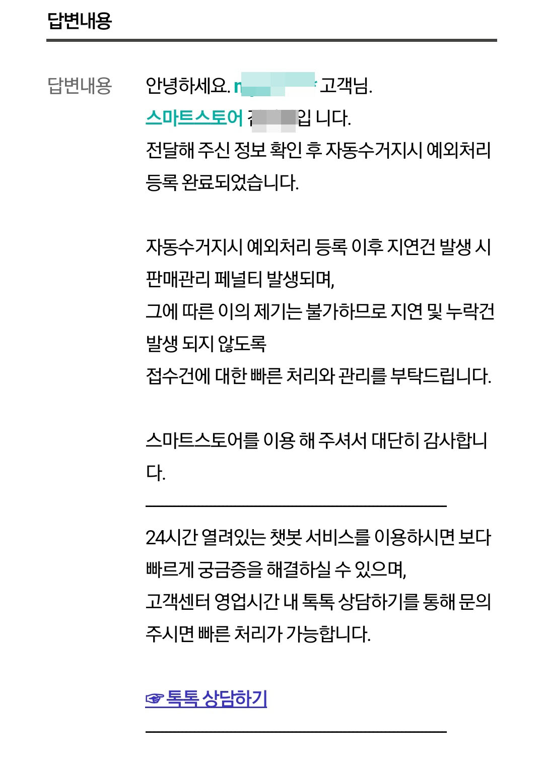 이것을 예방하는 것이 ‘스마트스토어 자동수거지시 예외처리'’입니다.