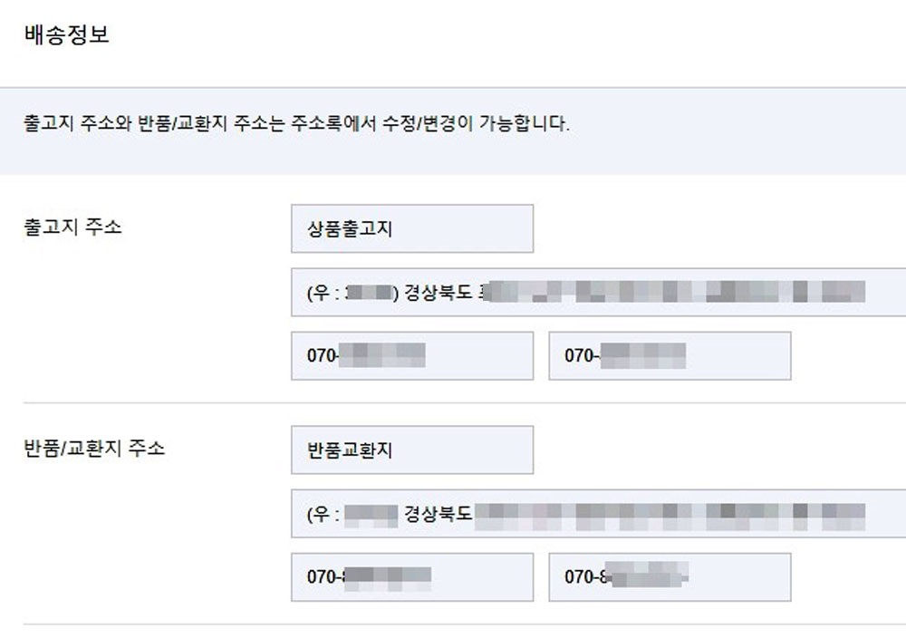 우리는 스마트 스토어에 출고지 주소와 반품/교환지 주소가 자신의 사업장(집) 주소로 되어있을 것입니다.
