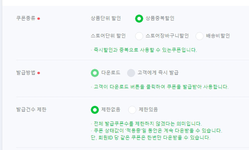 저는 어차피 회원ID 당 같은 쿠폰은 한번만 다운받을 수 있으니 ‘제한없음’에 체크를 했어요.