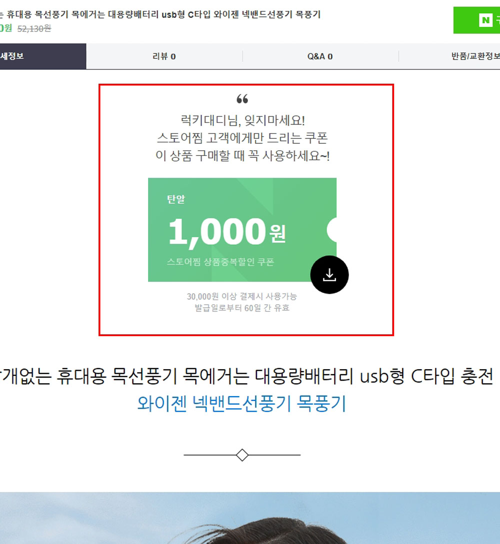 제품 상세페이지에 들어가 보니 아래 사진처럼 "스토어찜 쿠폰"이 나타납니다.