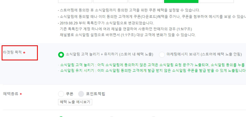 [타겟팅 목적]은 ‘소식알림 고객 늘리기 + 유지하기’ (스토어내 혜택 노출)과 ‘마케팅메시지 보내기’ (스토어에 혜택 노출 안됨)로 나누어집니다.