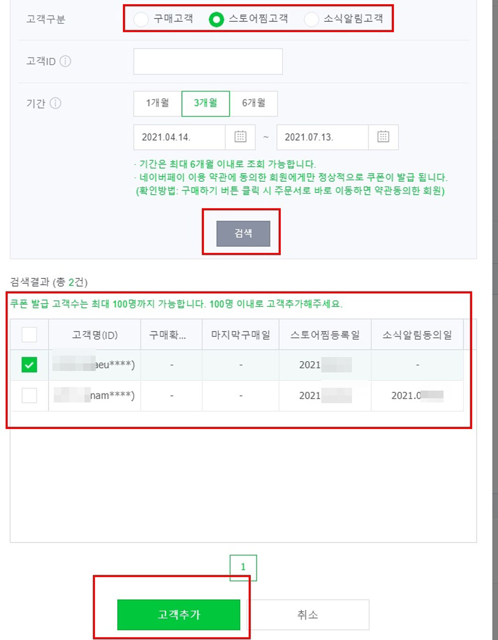 [고객구분]에 ‘구매고객’, ‘스토어찜 고객’ ‘소식알림 고객’중 선택하고 자신이 등록하고자하는 사람을 검색해 등록이 가능합니다.