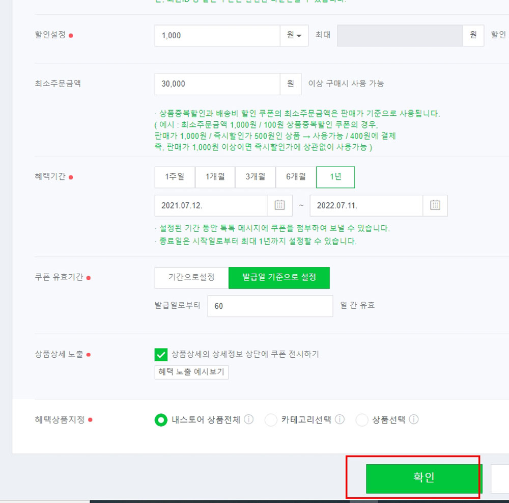 ‘최대 할인액’을 5천원으로 입력해두면 아무리 비싼 물건을 구매해도 5천 원 이상의 쿠폰은 발행되지 않게 됩니다.