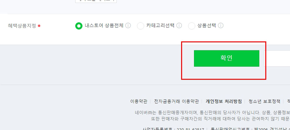 *‘내 스토어 상품전체’를 선택하게 되면 말 그대로 나의 스토어에 올라와 있는 모든 상품을 대상으로 쿠폰이 발행되게 됩니다.