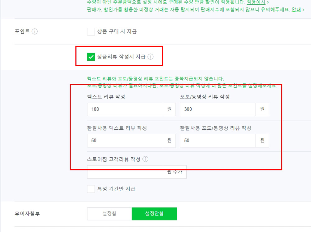 즉, 누군가 내 상품을 구매한 분이 리뷰를 한 글자만 달아도 자동으로 내 적립금에서 내가 설정한 금액이 차감된다는 의미입니다.