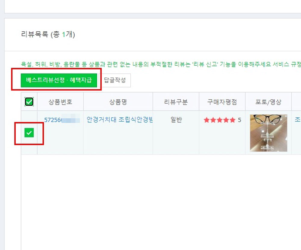 [베스트리뷰 여부]에 “선정”에 체크하고,