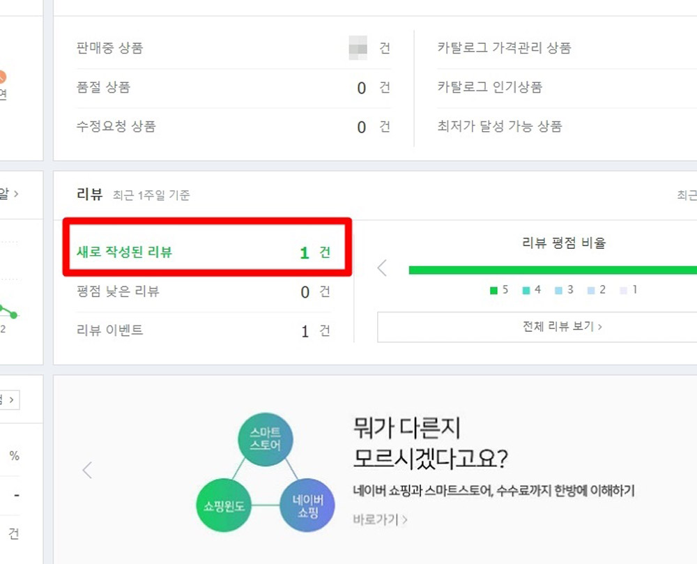 [스마트스토어 센터]메인화면에서 스크롤을 아래로 내려보니 [새로작성된 리뷰]에 “1건”이 있어요.