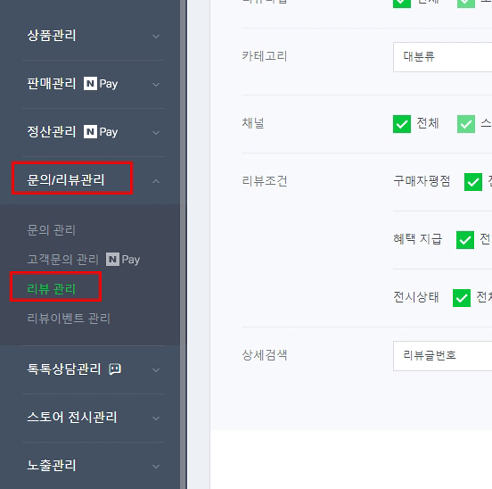 [문의/리뷰관리]-[리뷰관리]를 클릭해주세요.