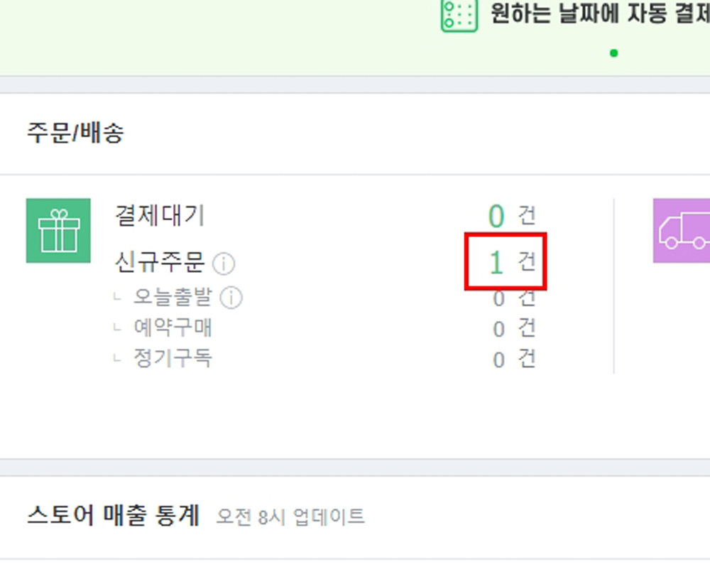 스마트스토어센터 메인화면에 가보면 아까는 [신규주문]에 1건이 이제는 [발주확인 완료]에 1건으로 넘어가 있는 것을 볼 수 있습니다.