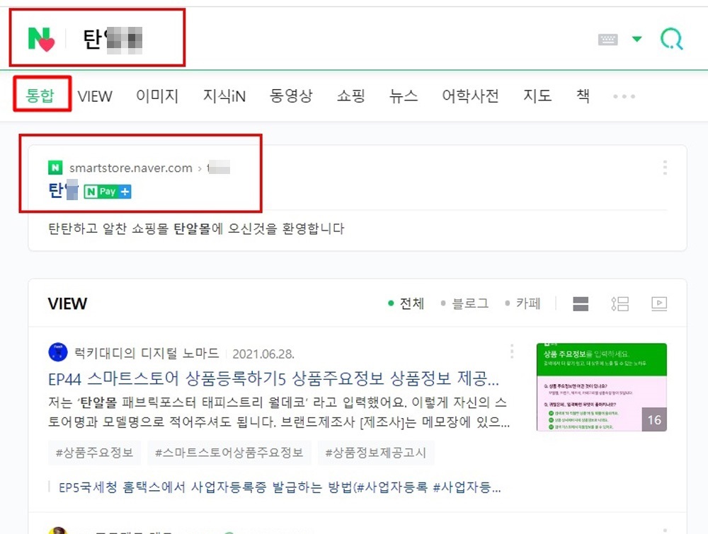 저는 몇 시간 후에 검색해보니 아래처럼 저의 스토어가 네이버 통합검색에서 최 상단에 검색이 됩니다.
