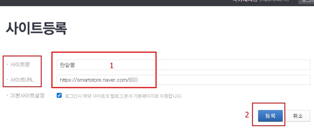 “사이트명”에 자신의 스마트스토어 이름, “사이트URL”에 자신의 몰 URL주소를 복사해 넣어주세요. 그리고 [등록]버튼을 클릭해 주세요.