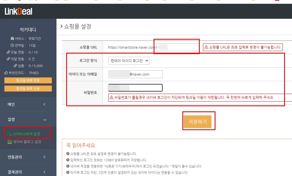 꼭 스마트스토어에 먼저 로그인을 먼저 해보고 한 번에 바르게 입력해 주세요.