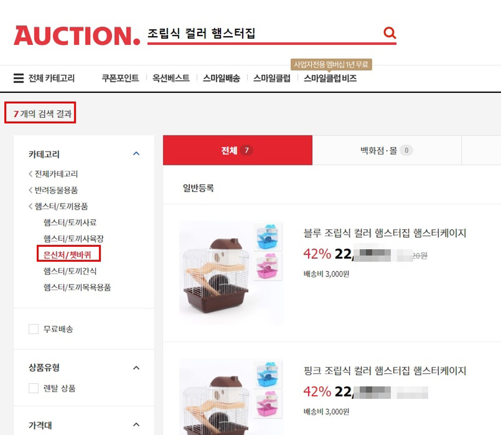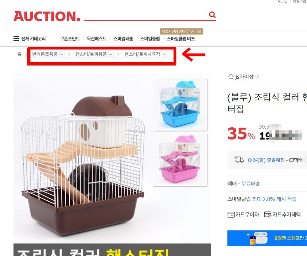 그러나 지금 옥션과 지마켓에서 카테고리는 [반려동물용품>햄스터/토끼용품>햄스터/토끼사육장]으로 다르게 나온다는 것을 알 수 있습니다.