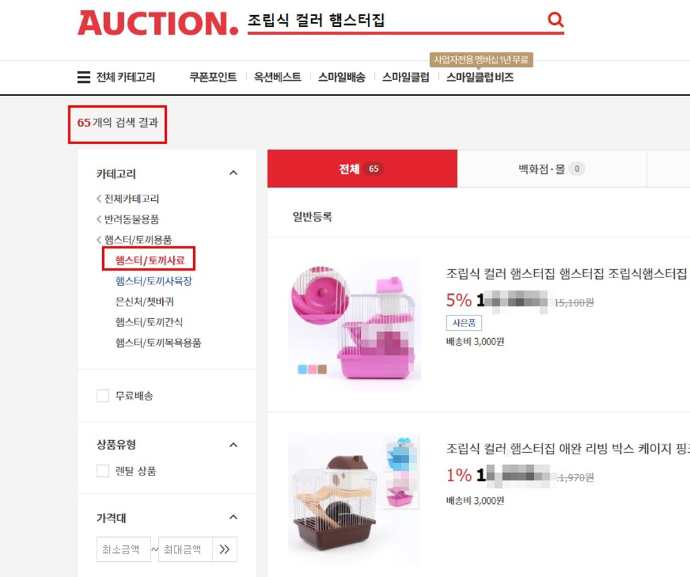 그러나 저는 햄스터집이 65개의 상품이 잇는 [햄스터/토끼사료]보다는,