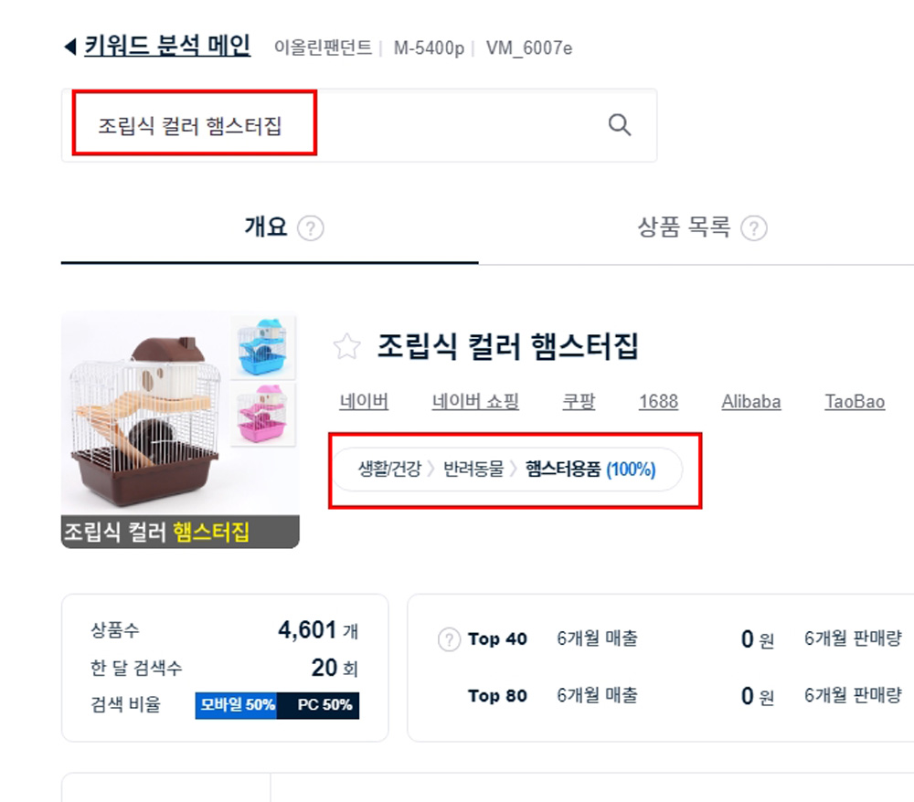 아이템스카우트에 접속해 이 상품명인 “조립식 컬러 햄스터집”이라고 검색하니 카테고리가 [생활/건강〉반려동물〉햄스터용품(100%)]라고 나옵니다.