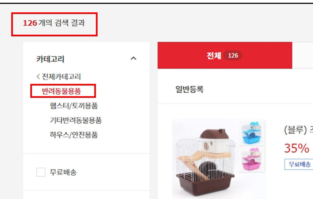 제일 먼저 대분류의 [반려동물용품]을 클릭하니 126개의 상품이 검색 되었습니다.