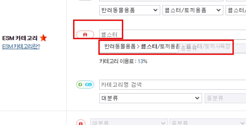 물론 위에서 설정한 “ESM 카테고리”에서 등록한 [반려동물용품>햄스터/토끼용품>햄스터/토끼사육장] 카테고리를 그대로 따라서 등록해도 되지만 아래 방법대로 하시는 것을 추천드립니다.