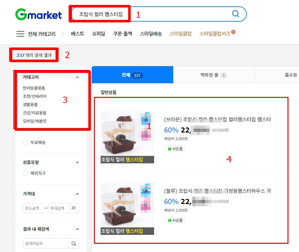 지마켓에 접속 후 이 상품의 풀 네임인 “조립식 컬러 햄스터집”으로 검색하니 총237개의 상품이 검색되었습니다.
