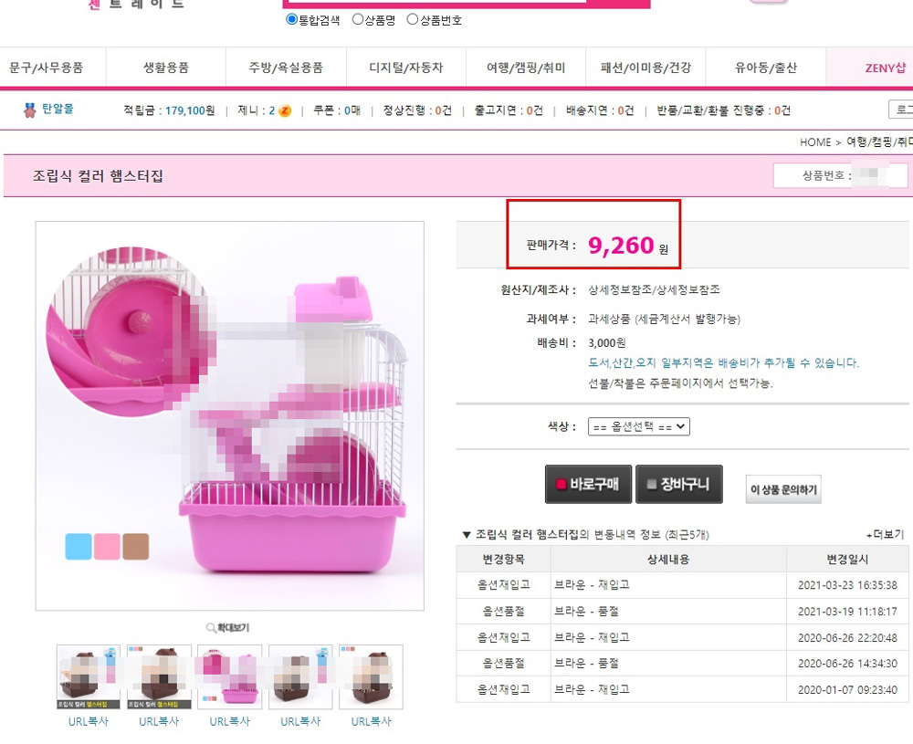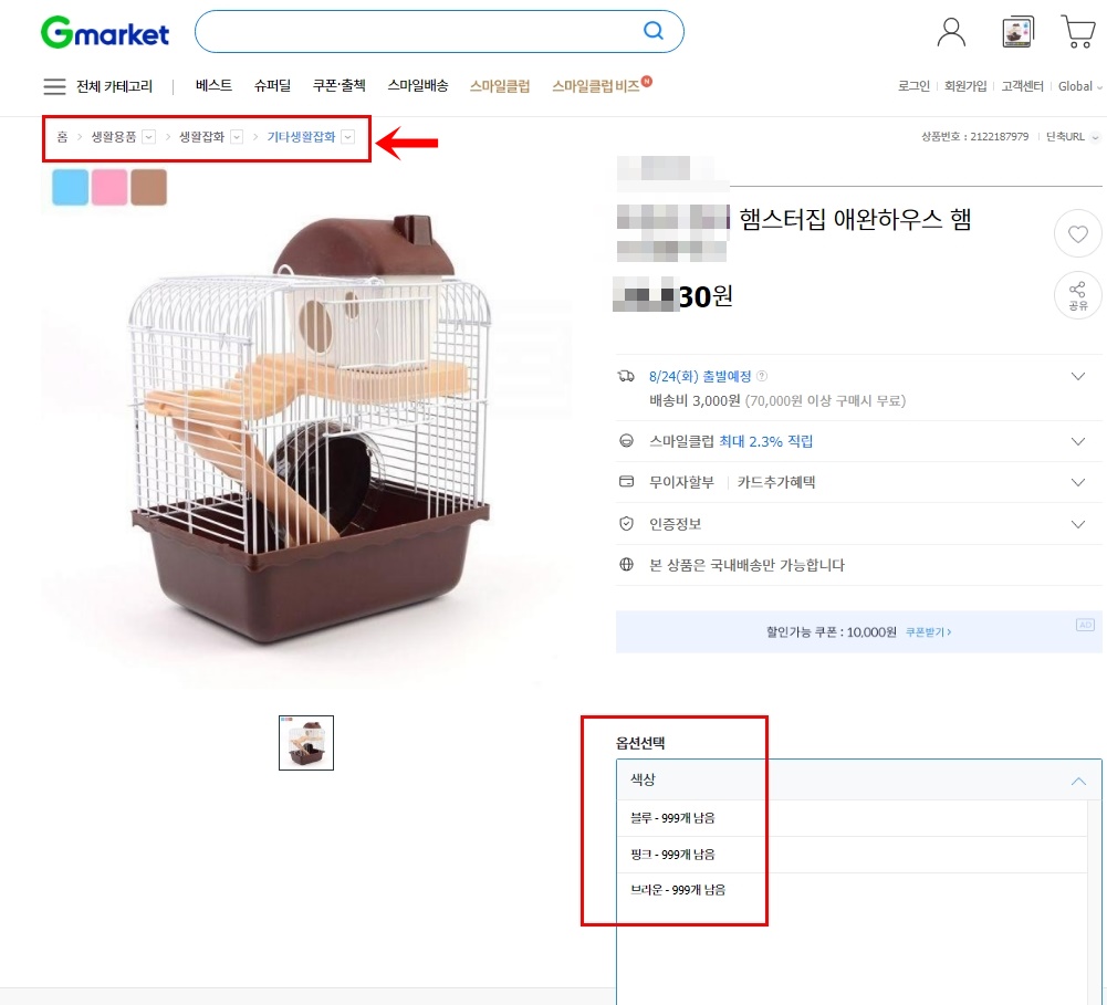지금 제가 등록하고자하는 “햄스터집”은 색상별로 선택해야하는 옵션이 있는 제품이며, 이 상품의 카테고리는 지난시간에 정한 [반려동물용품>햄스터/토끼용품>햄스터토끼사육장]입니다.