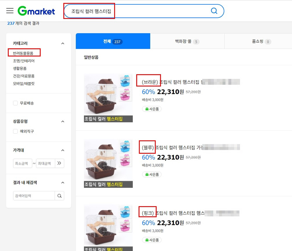 역시 다른 셀러분들도 [햄스터토끼사육장]에 등록을 할 때 옵션이 없이 상품명 앞에 색상을 적어서 단일 상품으로 색상별로 하나하나 등록을 했네요.