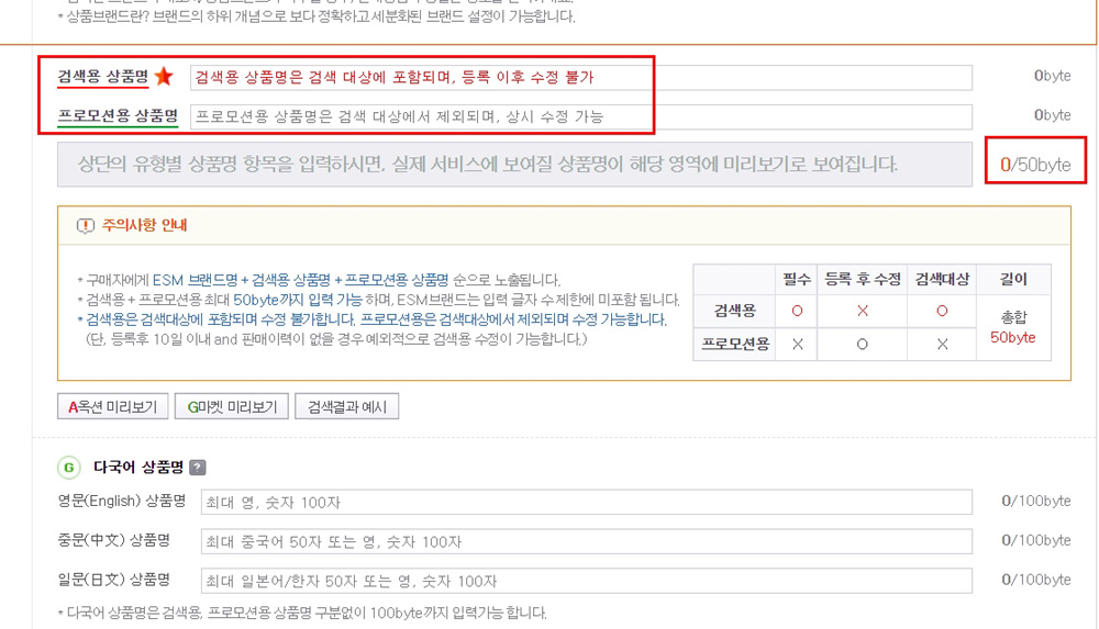 * 검색용 + 프로모션용 상품명은 두 개를 합해서 최대 50byte까지(띄어쓰기 포함) 입력 가능 하며, ESM브랜드는 입력 글자 수 제한에 미포함 됩니다.