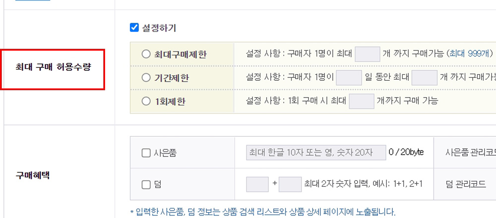 1회 구매시 최대 몇 개 까지 구매 가능하게 할 것인지를 설정 할 수 있습니다.