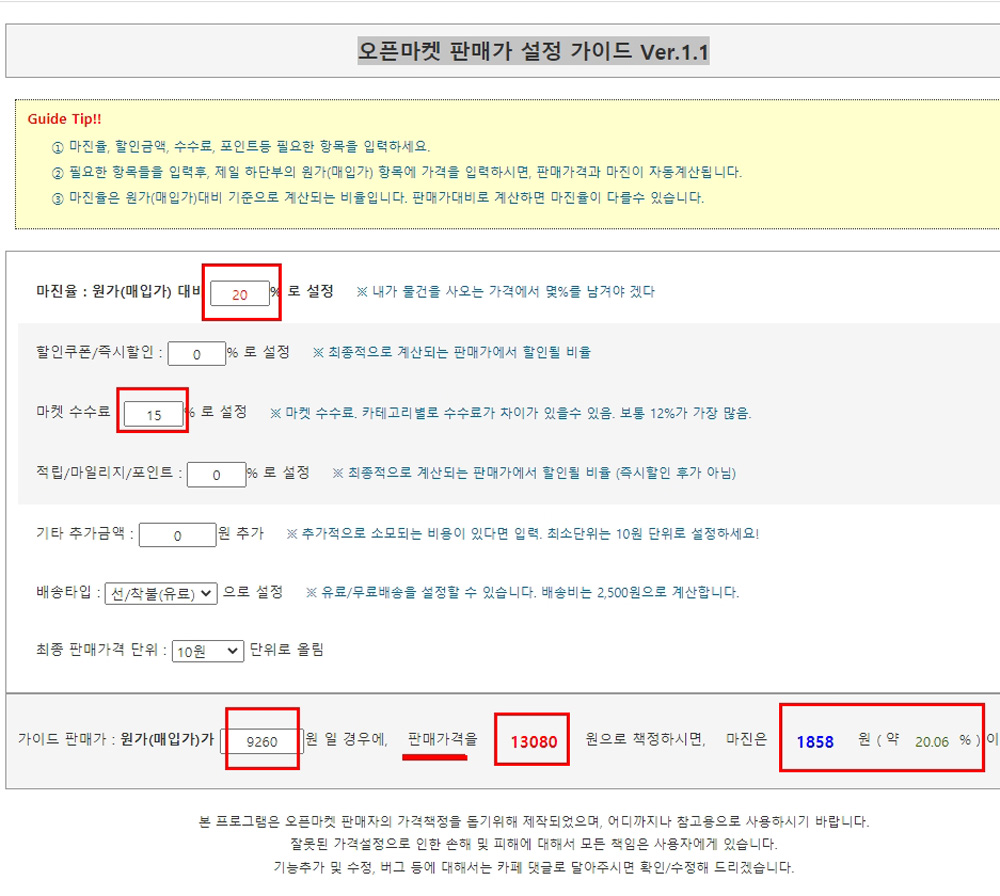 즉, 내가 20% 마진을 보려면 13,080원에 판매가를 등록해 1,858원 이득을 보라는 말입니다.