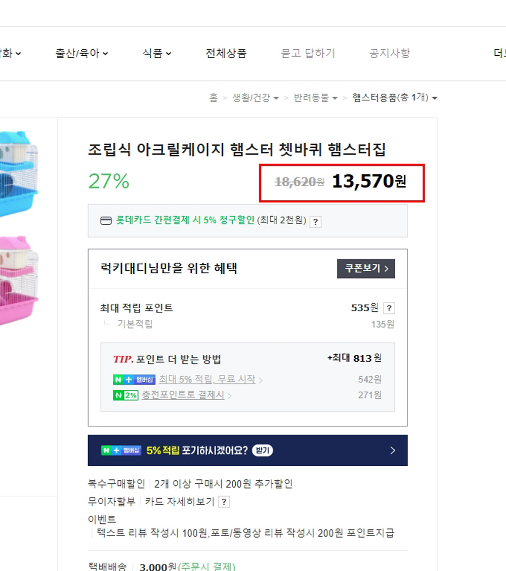 자세히 살펴보니 이 상품 카테고리가 “햄스터집”임에도 불구하고 [생활용품>생활잡화>기타생활잡화]로 되어져있습니다,