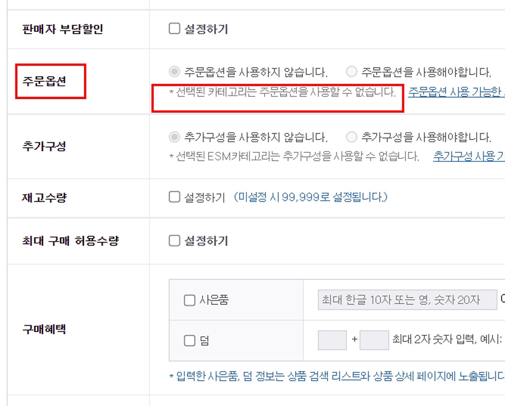 즉, 옵션이 있는 제품이라도 카테고리가 어떤 것이냐에 따라 옵션등록을 못하고 각자 개별적으로 여러번 상품등록을 해야 할 수도 있다는 의미입니다.