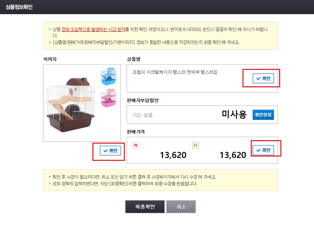 틀린 부분이 있나 확인하고 [확인]이라고 되어져 있는 버튼을 다시 한 번씩 클릭해주세요.