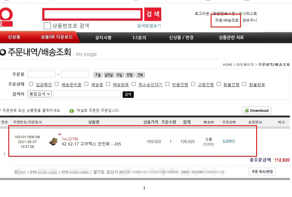 [주문번호]를 클릭해보면 주문자 정보가 나오며,