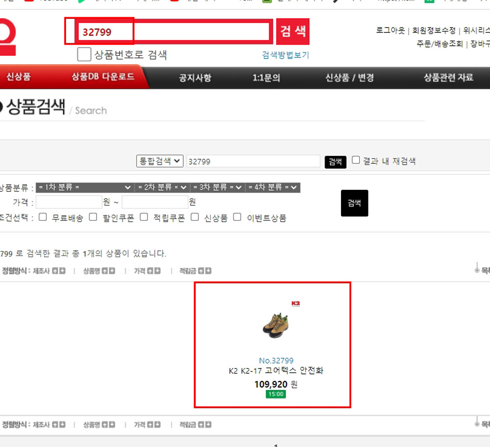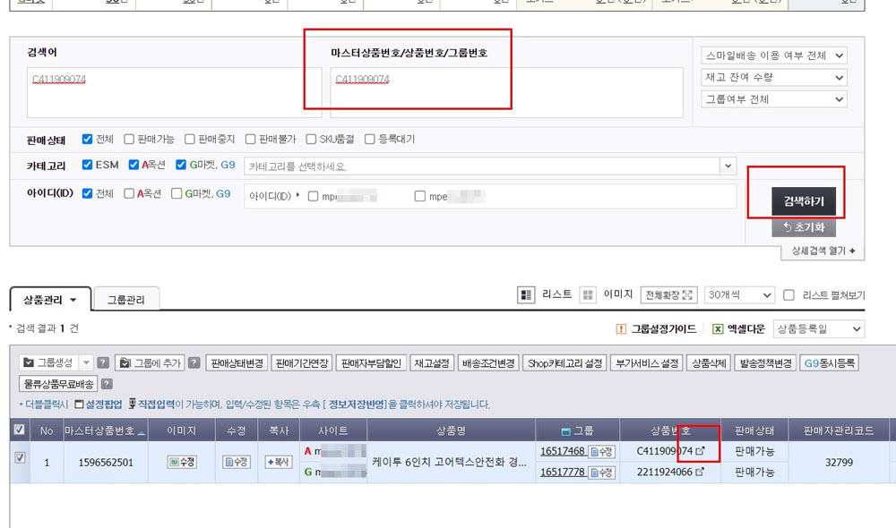 [마스터상품번호/상품번호/그룹번호]란에 복사한 “상품번호”를 붙혀넣기하고 [검색하기]를 클릭하니 해당 상품이 검색됩니다.