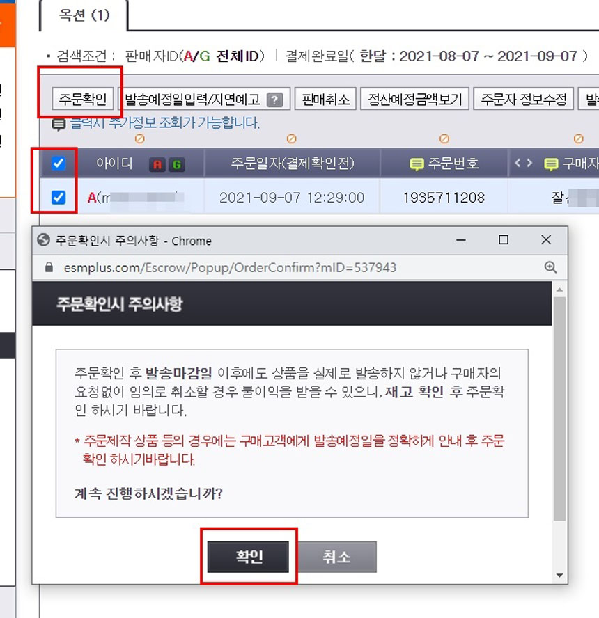 다시 ESM플러스에 돌아와서 해당건에 체크를 하고 [주문확인]버튼을 클릭해주세요.