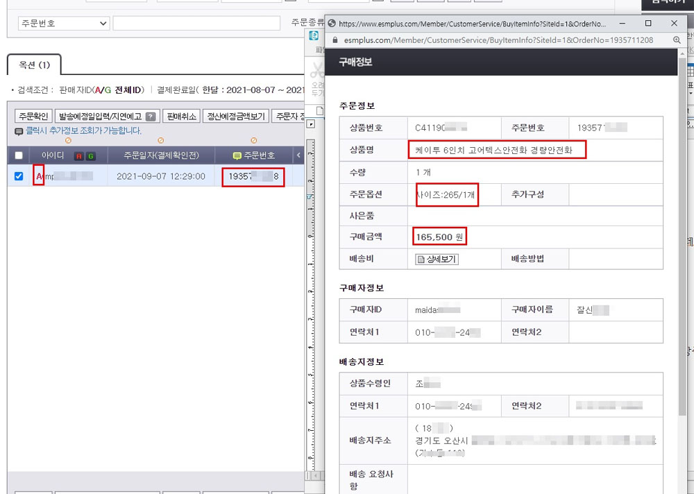 ESM에서 [주문번호]를 클릭하면 구매정보가 뜨는데,