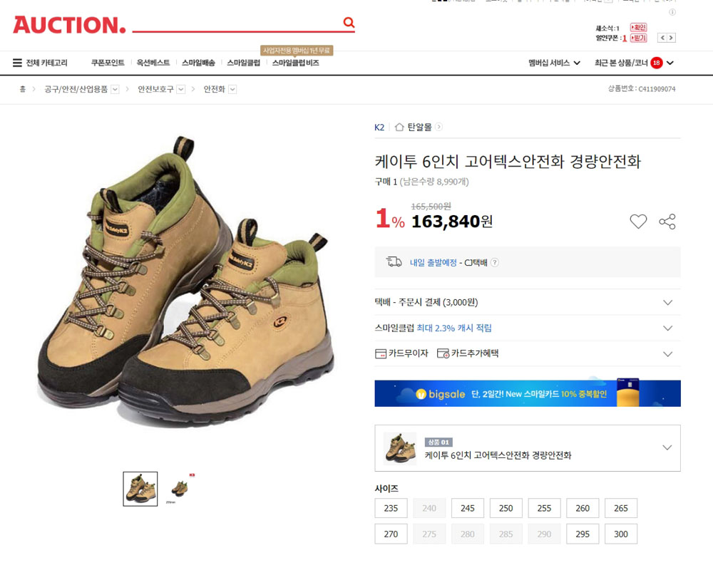저는 옵션이 있는 제품인데, “K2고어텍스 안전화 265mm” 소비자가 165,500원에 등록한 것이 팔렸습니다.