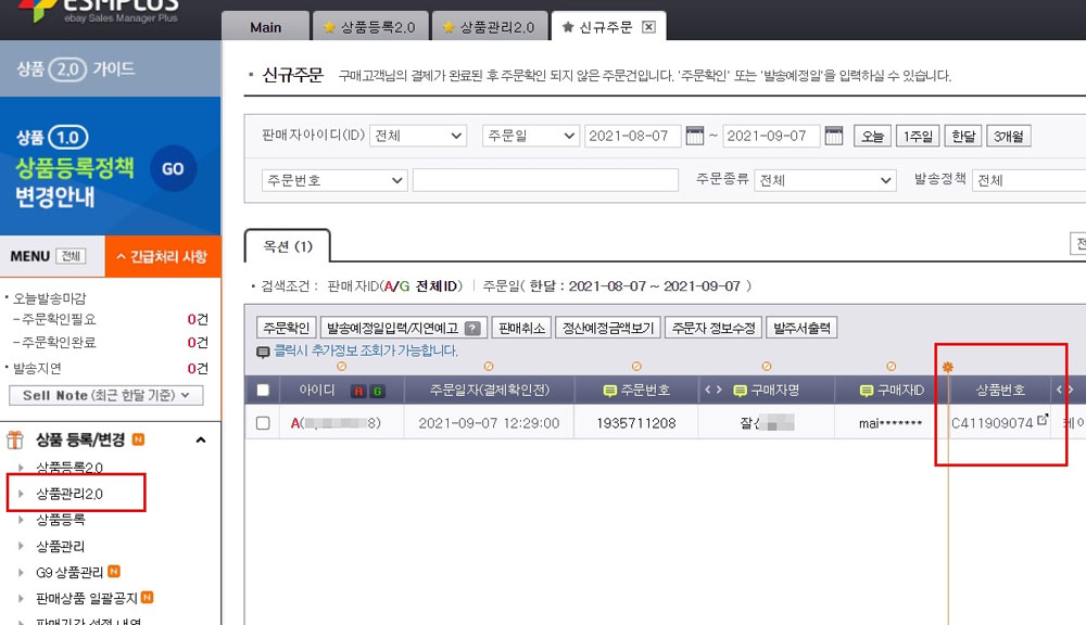 그리고 “상품번호”를 복사한 후 좌측의 [상품관리2.0]을 클릭해보았어요.