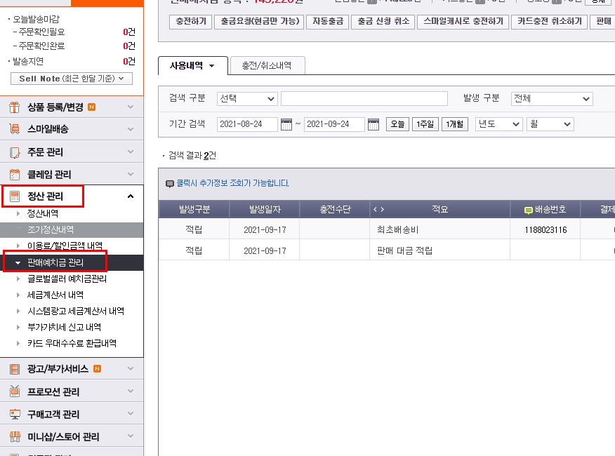 [ESM>정산관리>판매예치금 관리]를 클릭해주세요.