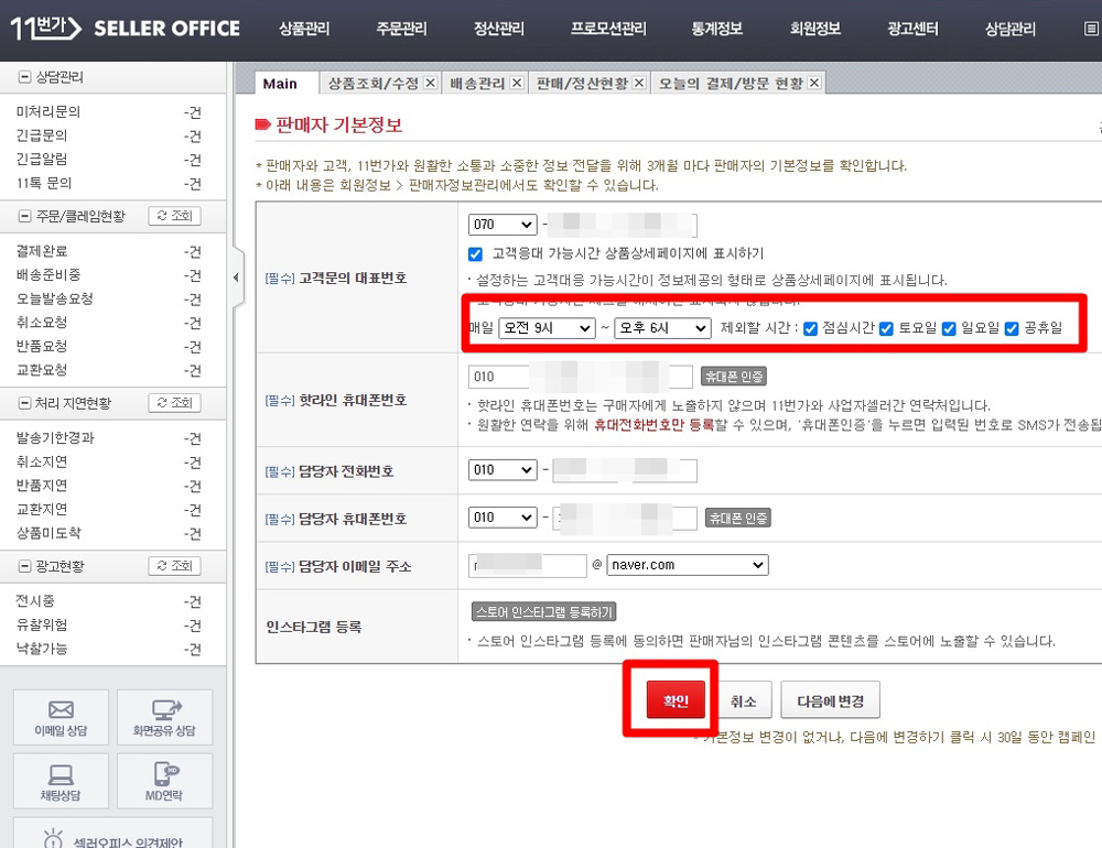 여기서 기본정보를 확인하고 고객응대 가능시간대도 설정을 하고,