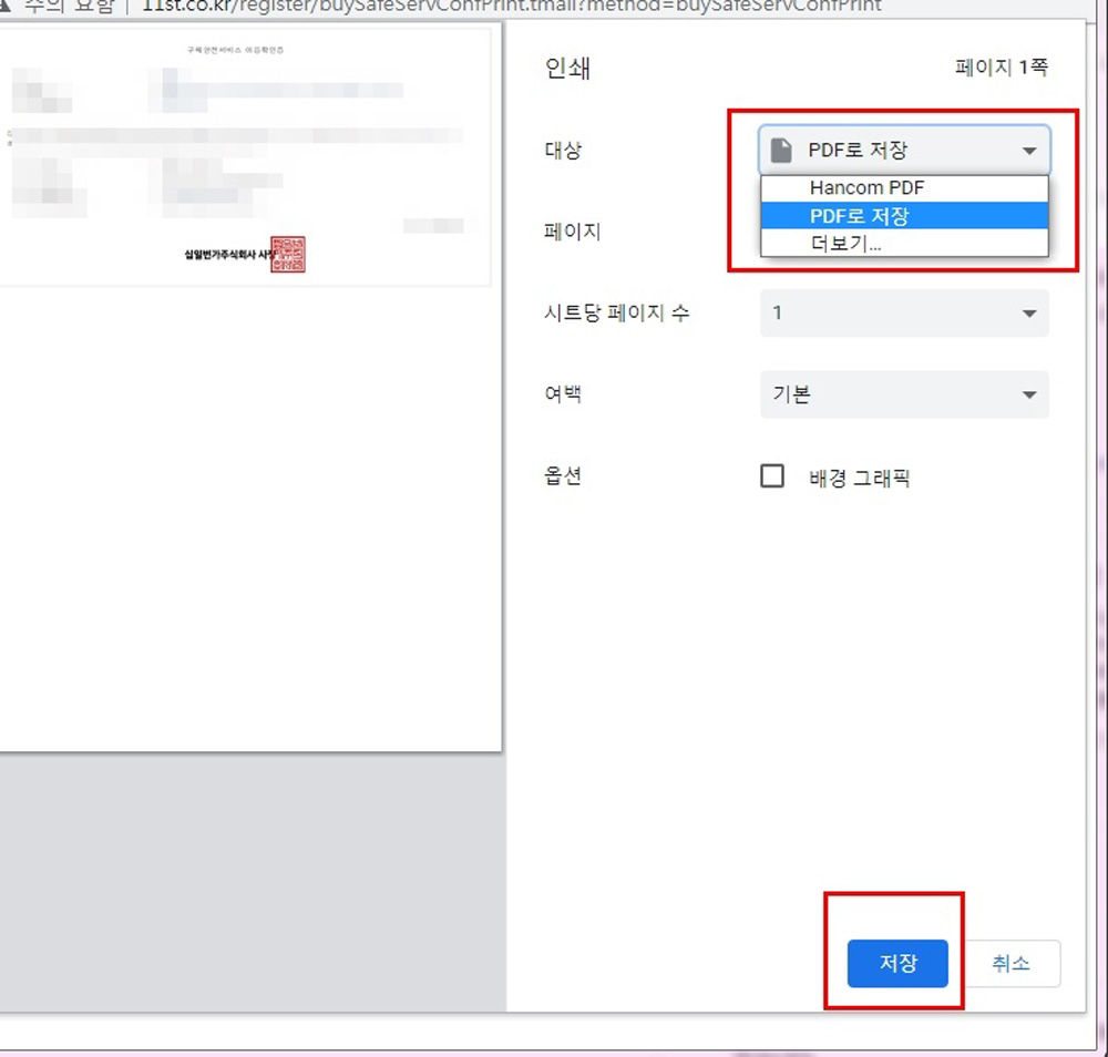 바로 인쇄도 가능하지만 파일로 저장하시려면 “대상”에서 [PDF로 저장]을 클릭해주세요.