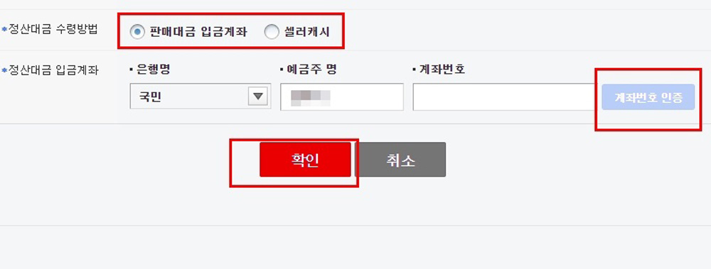 [정산대금 수령방법]에 계좌와 캐시가 있는데,