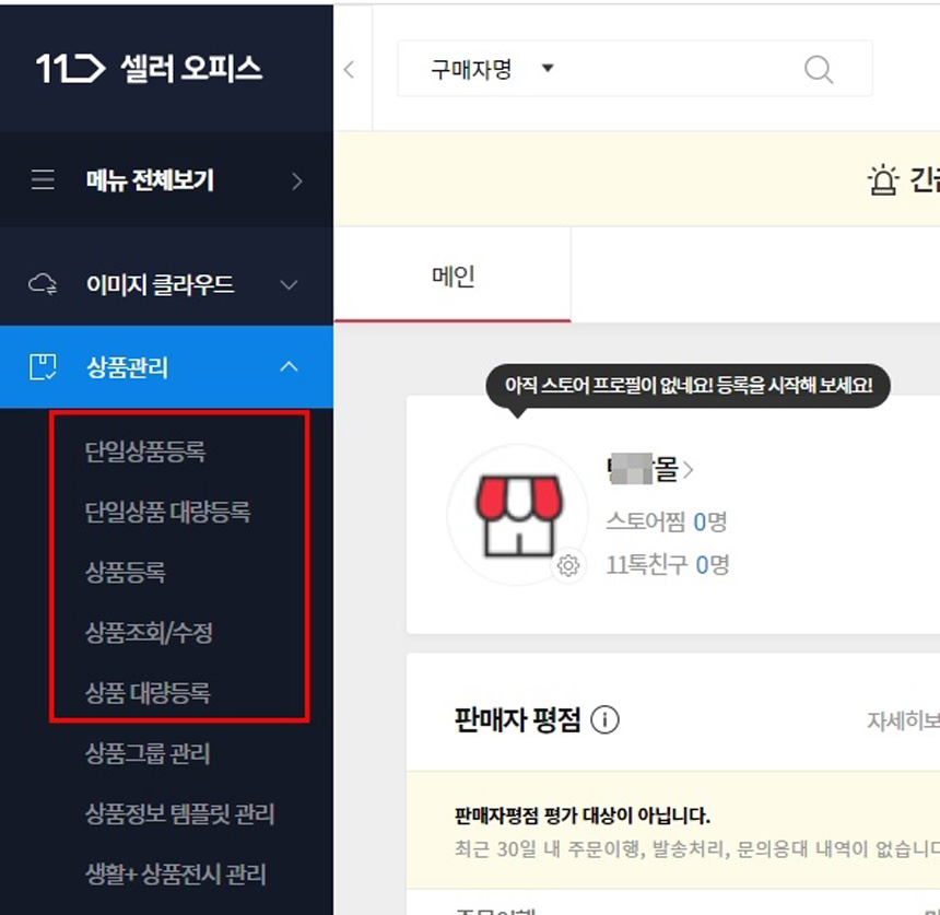 11번가 상품등록은 [셀러오피스]라는 폼에서 상품 등록 및 상품관리가 모두 이루어집니다.