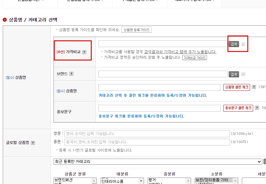 우측에 [상품명 클린체크]를 클릭해주세요.