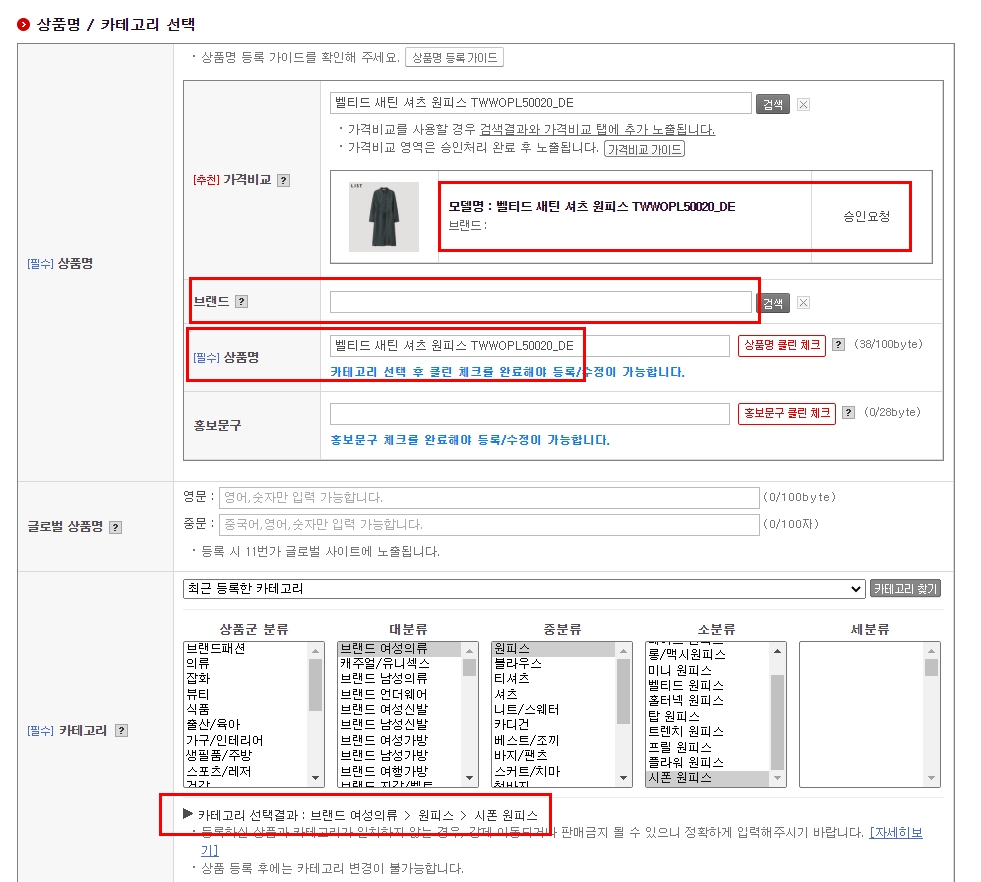 모델명이 승인요청상태이고 브랜드도 자동으로 나타납니다.