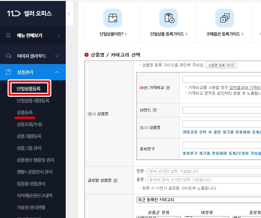 [셀러오피스>상품관리>단일상품등록]을 클릭해줍니다.