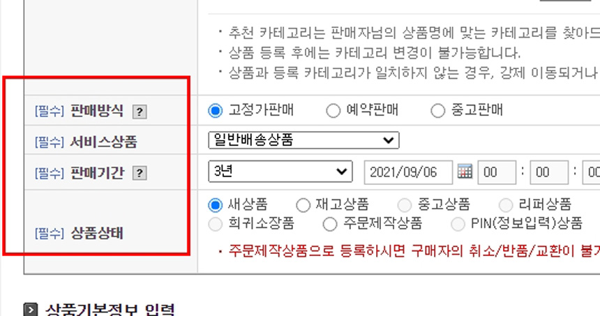 [판매방식]은 거의 “고정가판매”이며, [서비스상품]은 “일반배송상품”이며, [판매기간]은 저는“3년”으로 했어요. [상품상태]는 “새상품”이죠.