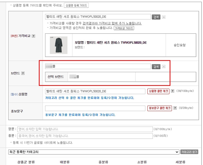 상품명이 자동으로 나타나며 브랜드명에만 공란으로 비워져 있습니다.
